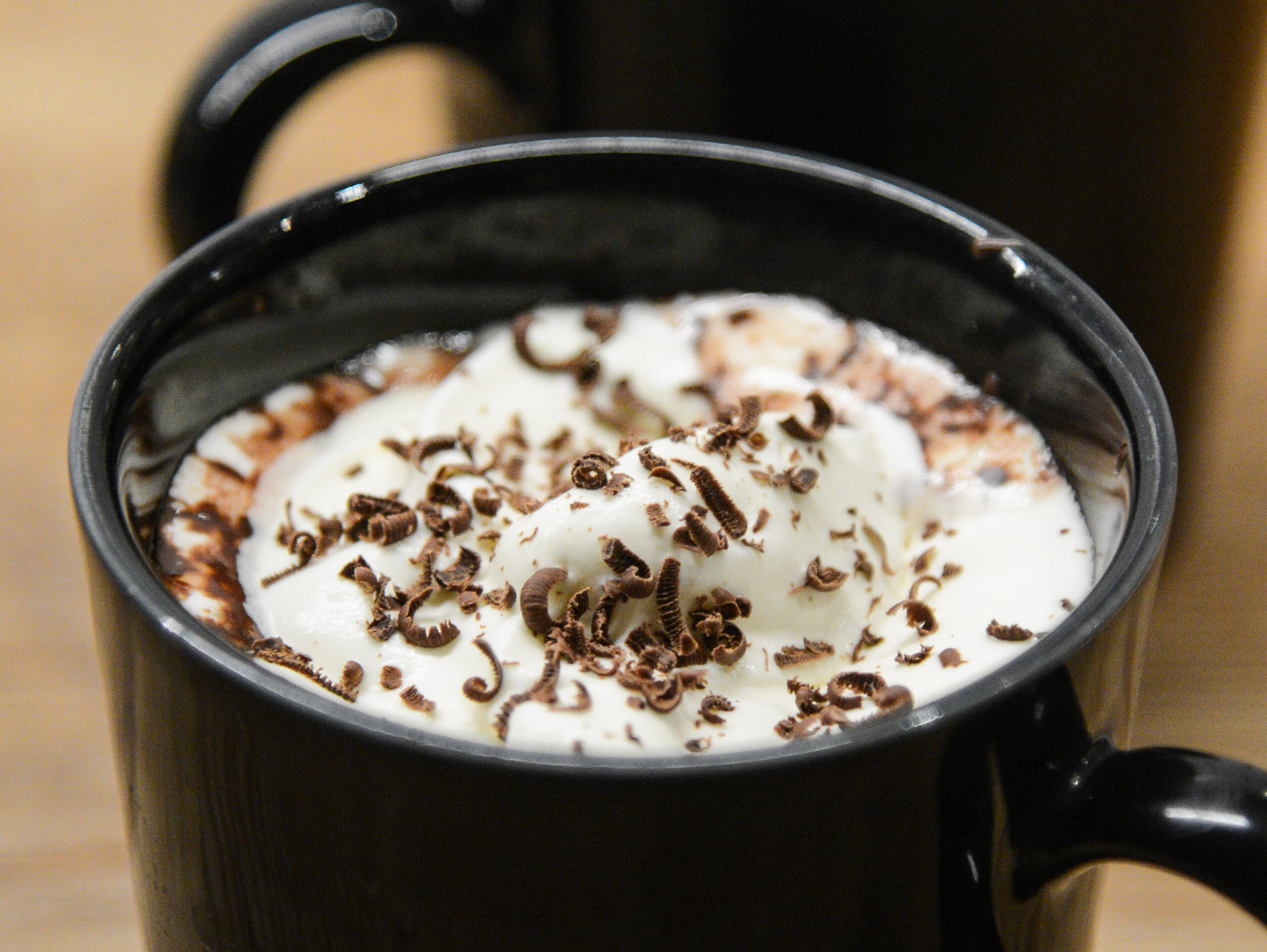 Vispa grädden parallellt. Tänk på att vispa så mycket så att du kan fylla på igen när du druckit halvvägs. Och den ska inte vara för hård, du vill inte ha några smörklumpar som flyter runt i chokladen.